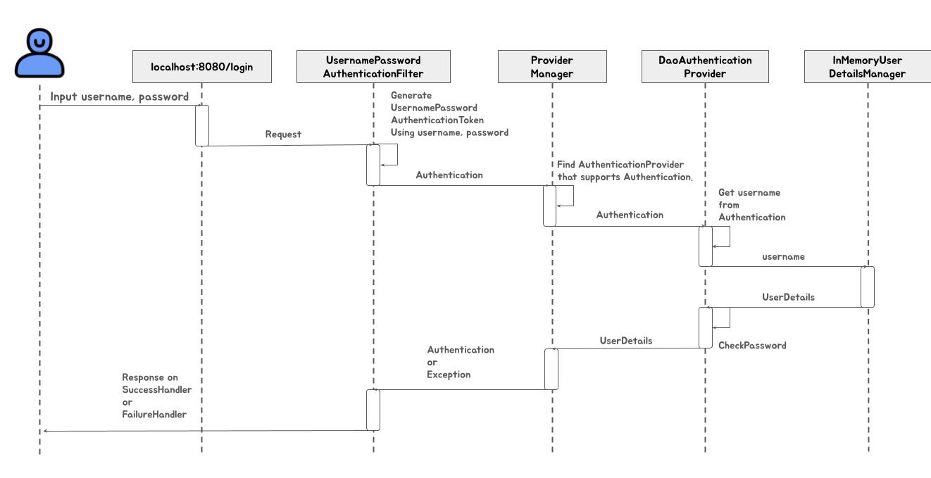 위의 복잡한 디버깅으로 알아본 formLogin의 흐름을 간단한 시퀀스 다이어그램으로 표현하면 다음과 같다.