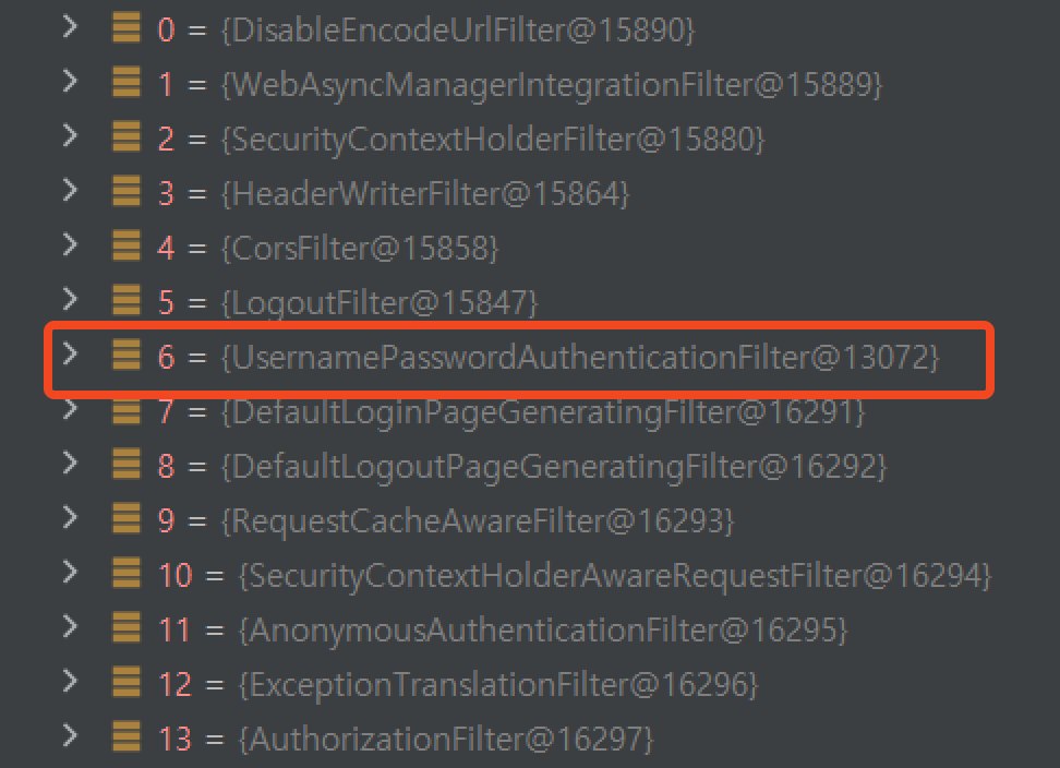 form Login 화면에서 username과 password를 입력하고 로그인 요청을 디버깅 해보면 다음과 같은 순서의 필터를 확인할 수 있다.