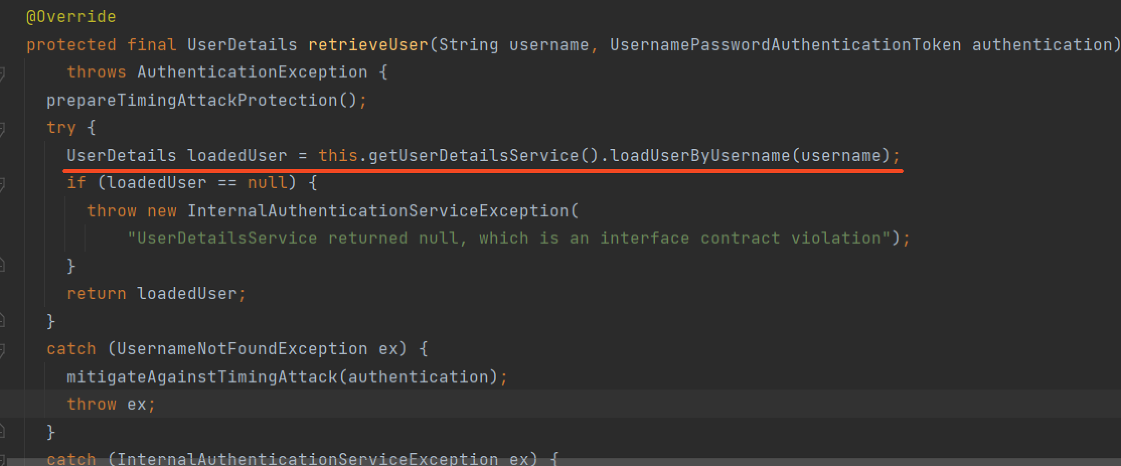 retrieveUser() 메서드를 통해 user를 반환받고 그 user를 additionalAuthenticationChecks() 메서드에 전달하여 추가적인 확인을 하는것 같다.