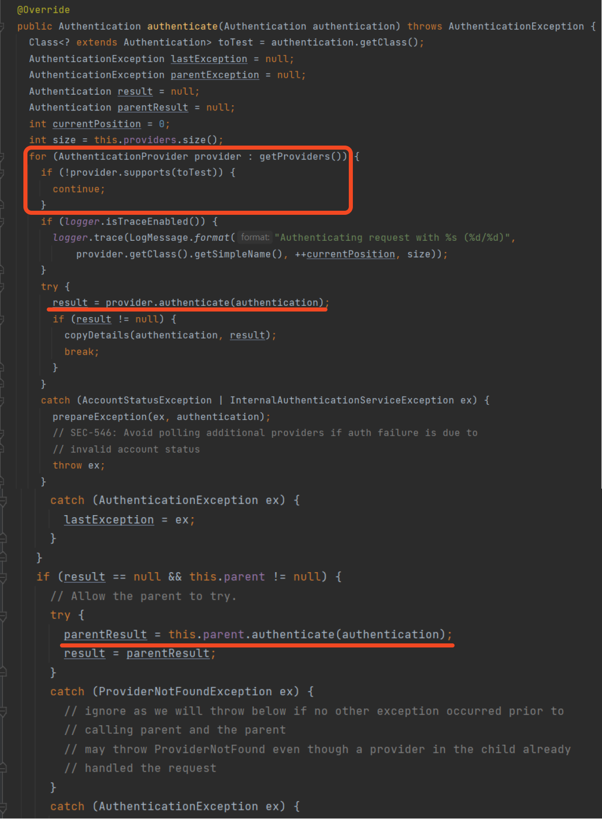 ProviderManager의 authenticate() 메서드를 살펴보면