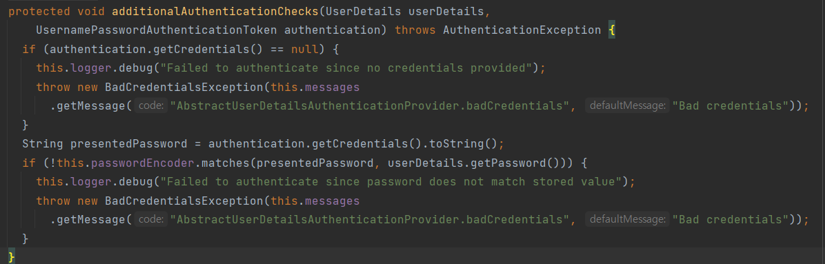 이번엔 addtionalAuthenticationChecks() 메서드를 살펴보자.