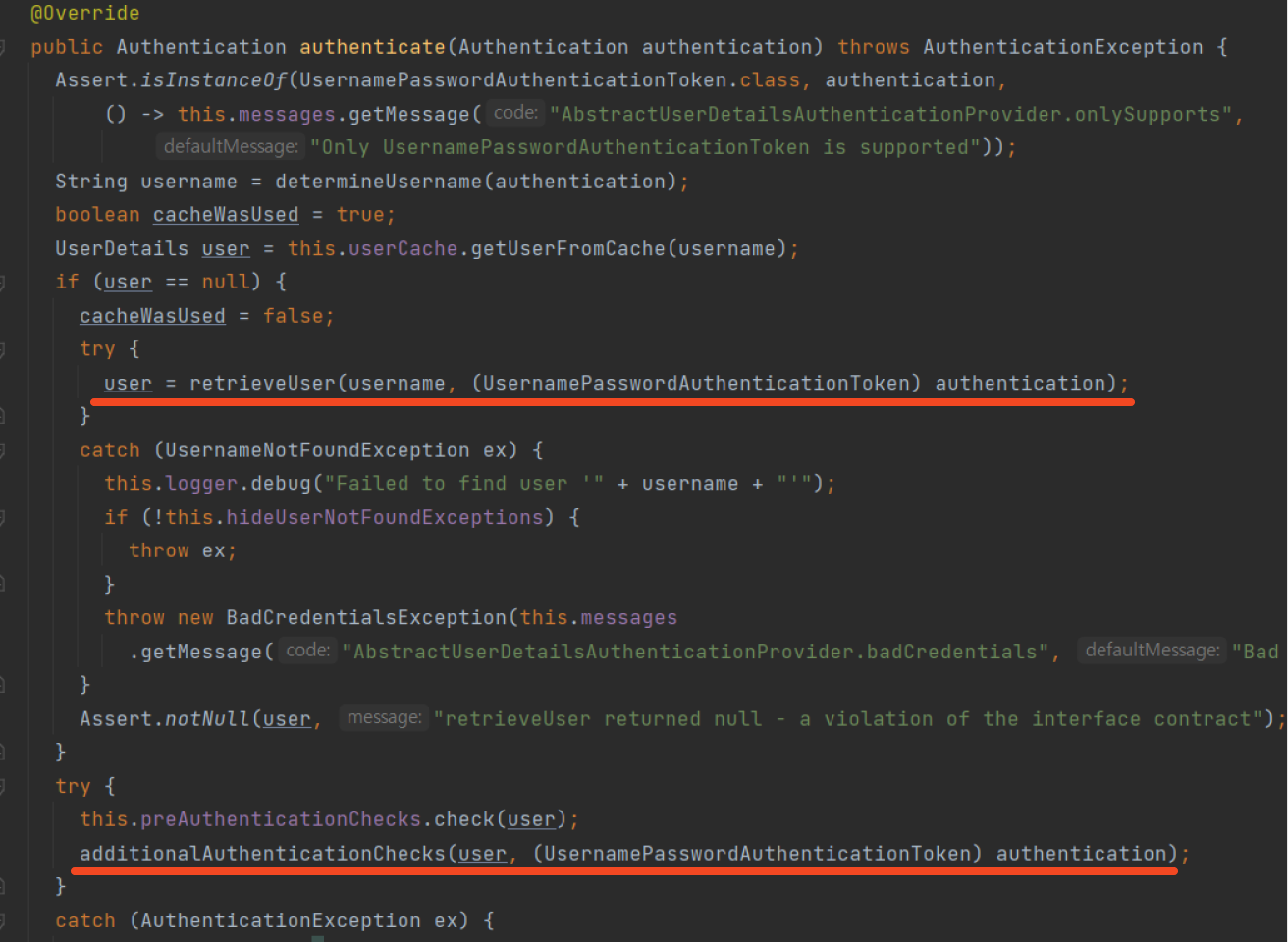 계속해서 살펴보자. AbstractUserDetailsAuthenticationProvider의 authenticate() 메서드를 살펴보면( DaoAuthenticationProvider는 AbstractuUserDetailsAuthenticationProvider를 상속)