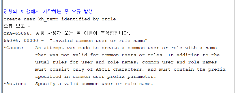 구글 검색해보니까 계정 사용자명은 C##{USER\_NAME}형식을 사용해야한다고 한다. 그대로 따라 주면 되긴 하는데 일단 실습에서는 일반 형식을 사용할 예정인데...