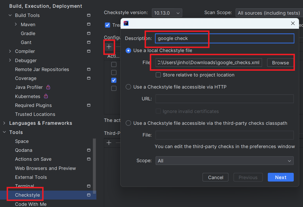 설정 → Tools → Checkstyle에서 설치한 naver-checkstyle-rules.xml import