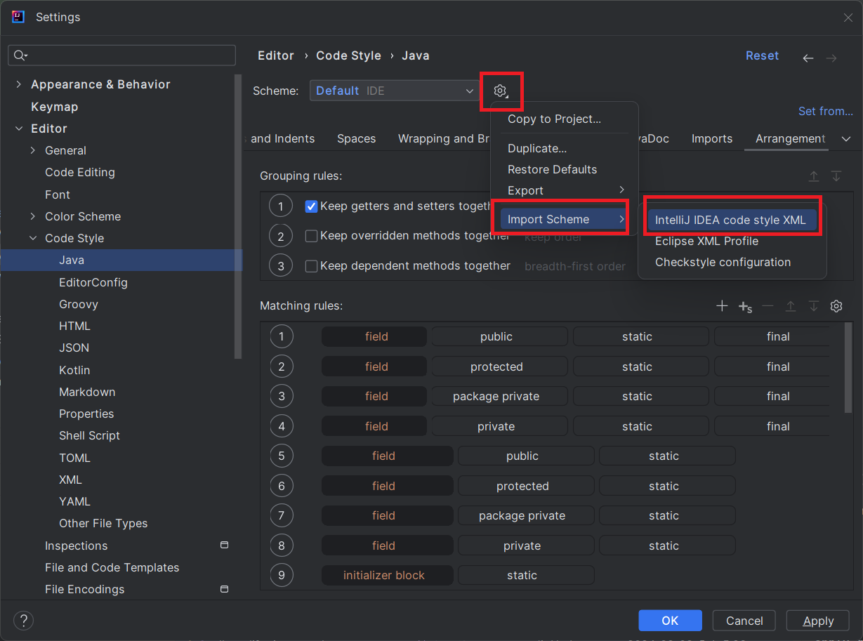 설정 → Editor → Code Style → Java에서 설치한 intellij-java-google-style.xml import