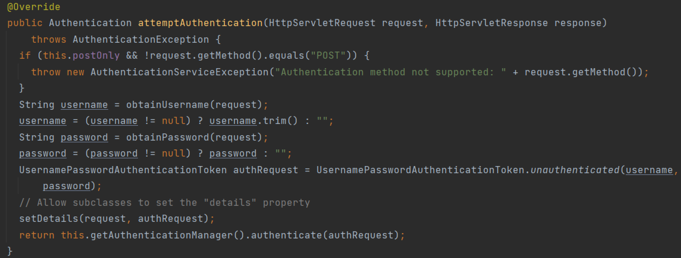 request로부터 username과 password를 가져와서 UsernamePasswordAuthenticationToken을 만들어 이를AuthenticationManager의 authenticate() 메서드에 전달한다.